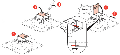 - Механизм устанавливается без снятия лицевой панели при фиксации на винтах.