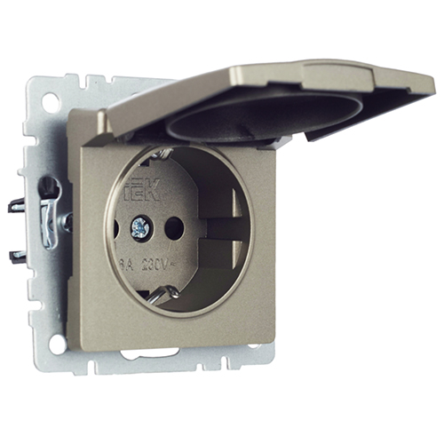 Розетка одноместная IEK РСбш10-3-БрШ Brite (16 А, IP20) скрытой установки, с заземлением и защитными шторками, с крышкой, шампань
