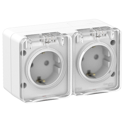 Розетка двухместная Schneider Electric ATN540126 AtlasDesign Profi54 (16 А, IP54) открытой установки, с заземлением, шторками и защитными крышками, белый