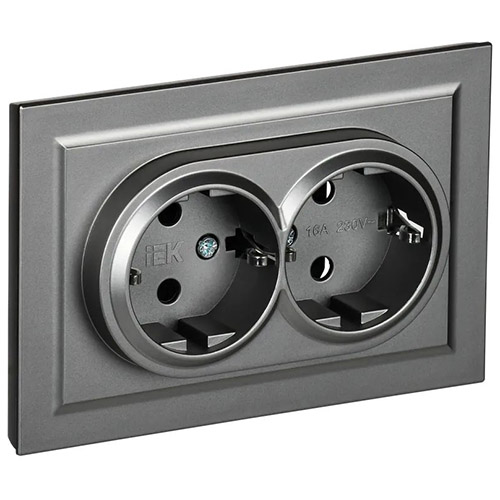 Розетка двухместная IEK РС12-3-БрС Brite (16 А, IP20) скрытой установки, с заземлением, в сборе, сталь