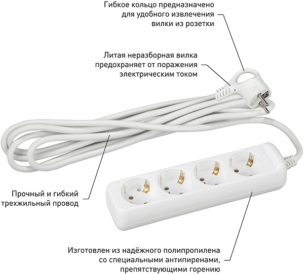 Удлинитель бытовой с заземлением предназначен для подключения электроприборов и электроинструментов мощностью до 3,5 кВт.