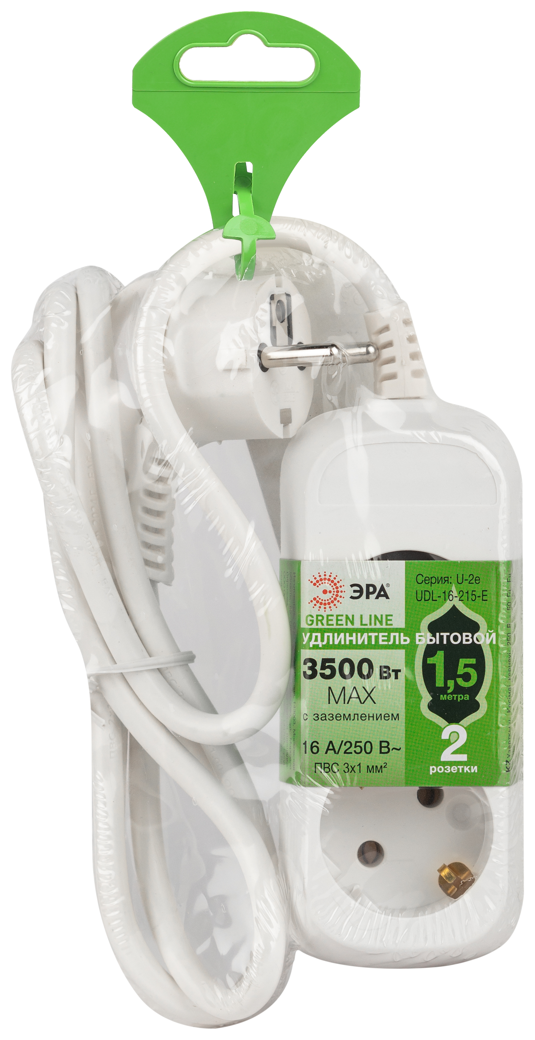 Удлинитель электрический Эра GREENLINE UDL-16-215-E с заземлением, на 2 розетки, провод 1,5м ПВС 3x1мм2. Рассчитан на максимальную мощность 16А/3500 Вт. Удлинитель станет Вашим надежным помощником, если любимые электроприборы находятся далеко от розеток. Корпус выполнен из ударопрочного и негорючего пластика (полипропилен). Вилка обеспечена кольцом для удобного извлечения ее из розетки. Модель удлинителя на 16А позволяет подключить бытовые приборы общей нагрузкой до 3500Вт.