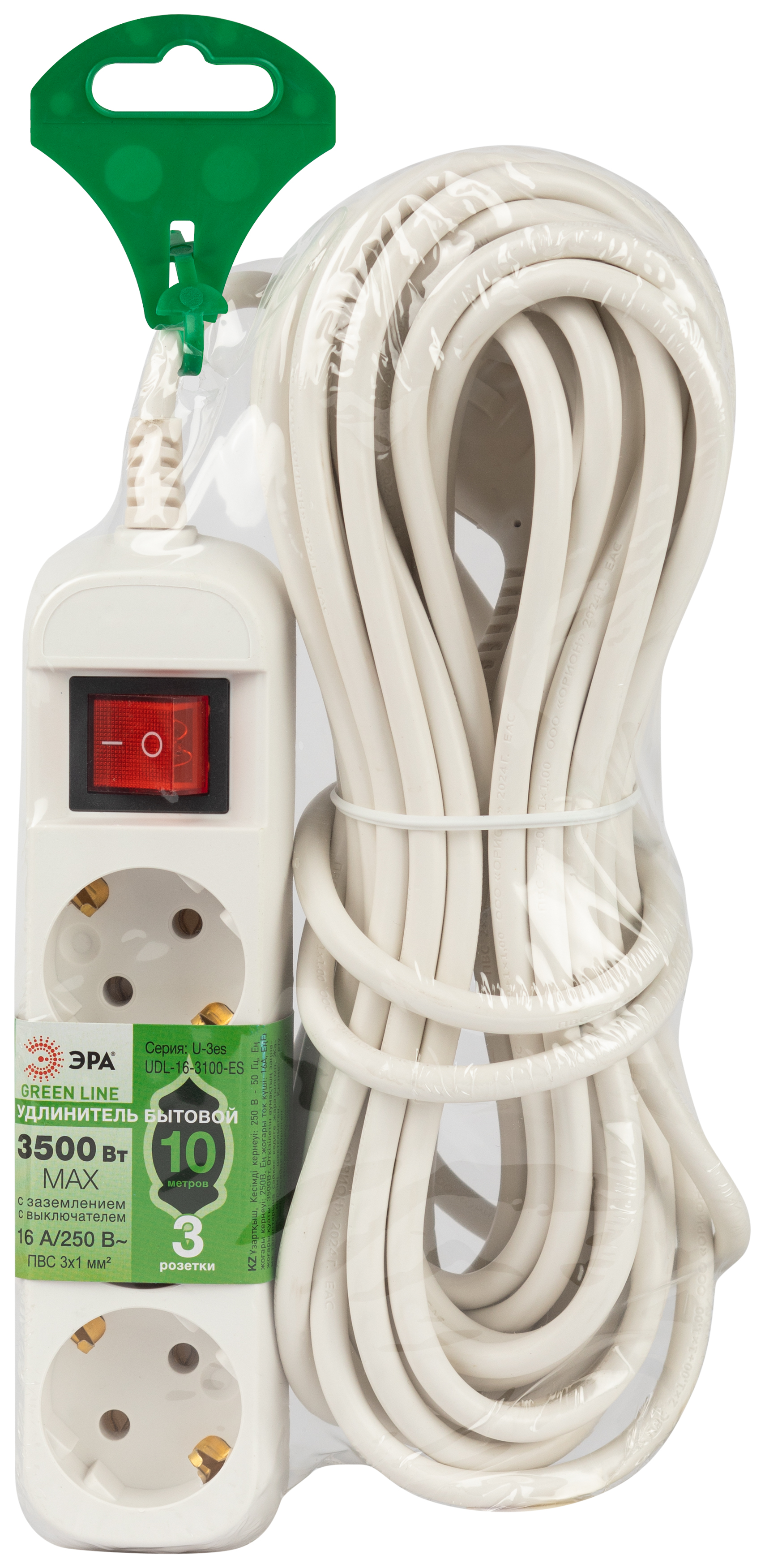 Удлинитель электрический Эра GREENLINE UDL-16-3100-ES с заземлением, с выключателем, на 3 розетки, провод 10м ПВС 3x1мм2. Рассчитан на максимальную мощность 16А/3500 Вт. Удлинитель станет Вашим надежным помощником, если любимые электроприборы находятся далеко от розеток. Корпус выполнен из ударопрочного и негорючего пластика (полипропилен). Вилка обеспечена кольцом для удобного извлечения ее из розетки. Модель удлинителя на 16А позволяет подключить бытовые приборы общей нагрузкой до 3500Вт.