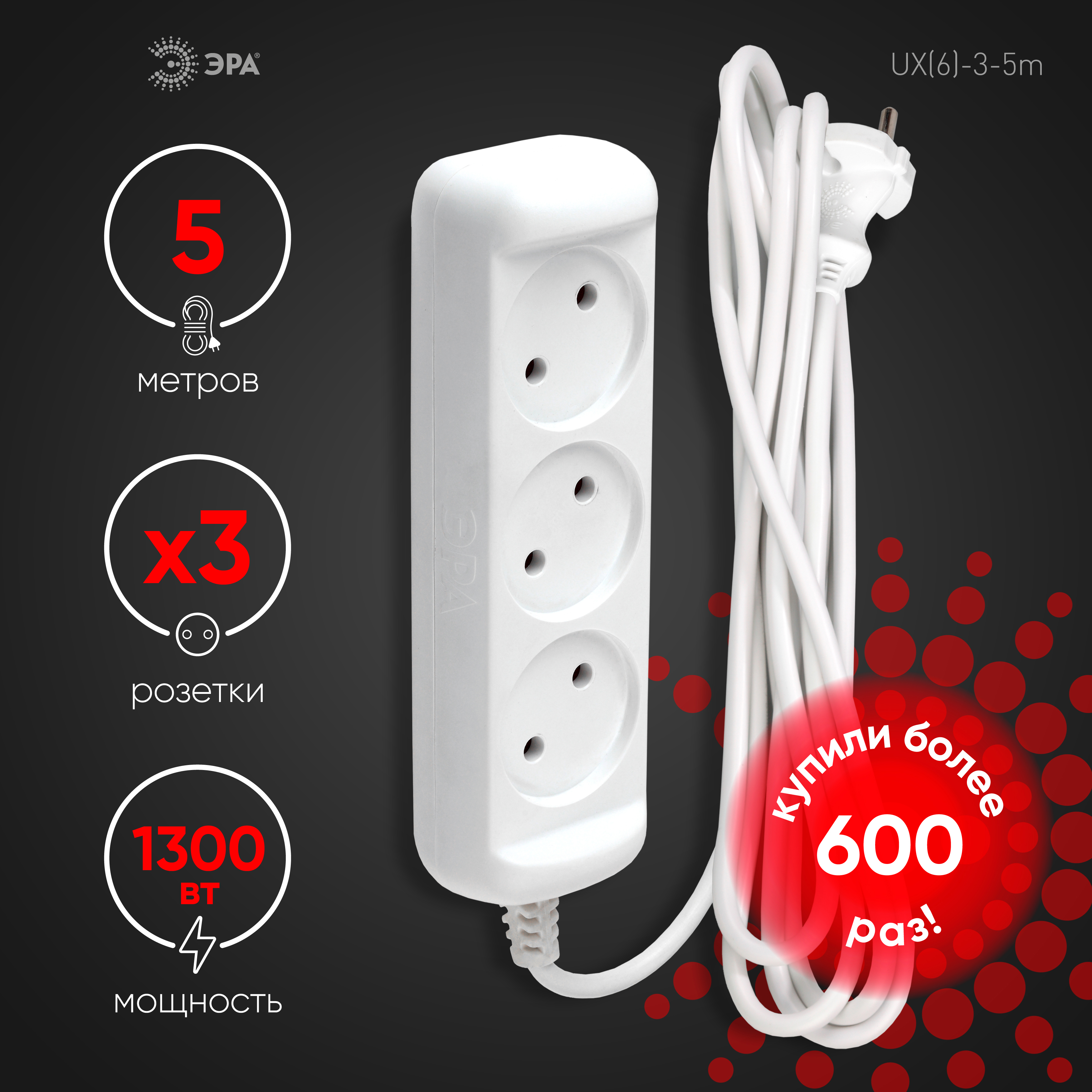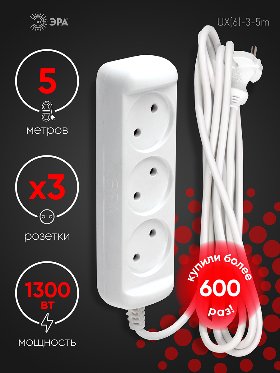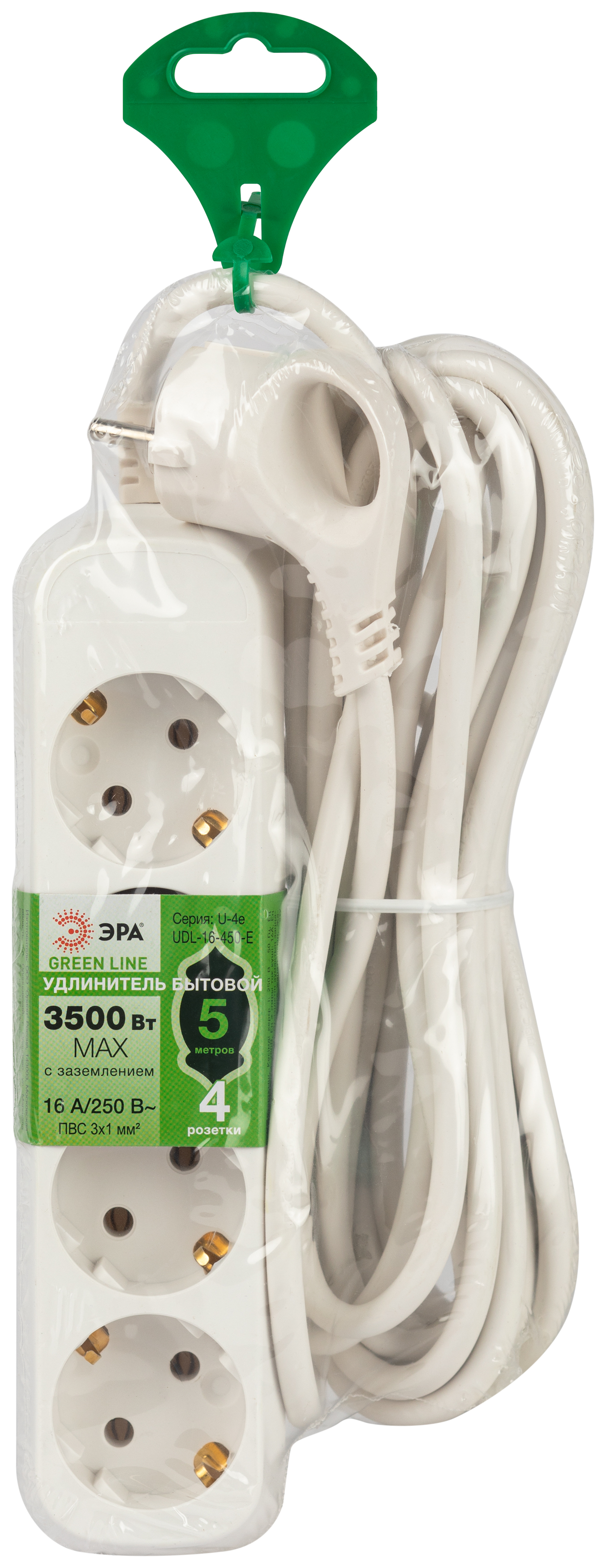 Удлинитель электрический Эра GREENLINE UDL-16-450-E с заземлением, на 4 розетки, провод 5м ПВС 3x1мм2. Рассчитан на максимальную мощность 16А/3500 Вт. Удлинитель станет Вашим надежным помощником, если любимые электроприборы находятся далеко от розеток. Корпус выполнен из ударопрочного и негорючего пластика (полипропилен). Вилка обеспечена кольцом для удобного извлечения ее из розетки. Модель удлинителя на 16А позволяет подключить бытовые приборы общей нагрузкой до 3500Вт.