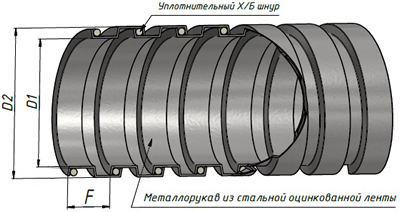Наличие уплотнения не делает металлорукав герметичным, но позволяет использовать его в системах вентиляции и для транспортировки крупнодисперсных сыпучих веществ.