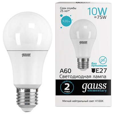 Лампа светодиодная Gauss 23220 Elementary (A60, 220 В, E27, 10 Вт, 920 лм, 4100 К)