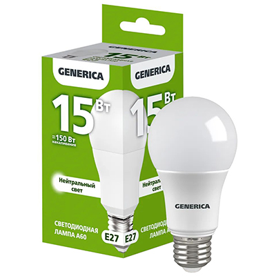 Лампа светодиодная Generica LL-A60-15-230-40-E27-G (груша, 220 В, 15 Вт, 1500 лм, 4000 К)