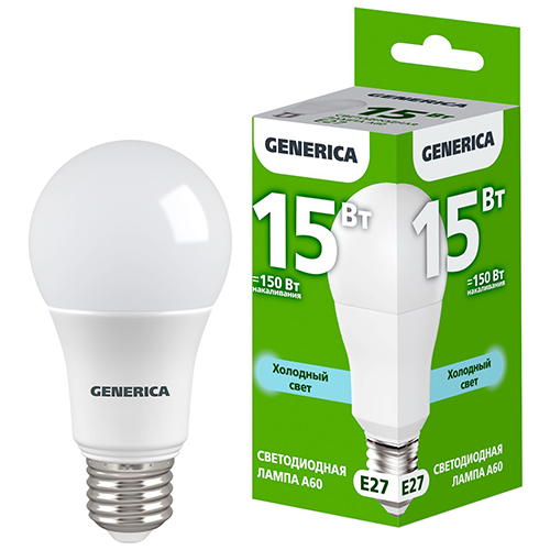 Лампа светодиодная Generica LL-A60-15-230-65-E27-G (A60 груша, Е27, 220 В, 15 Вт, 1500 лм, 6500 К)