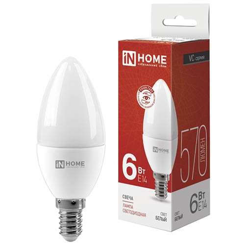 Лампа светодиодная IN HOME LED-Свеча-VC 6 Вт Е14 (С37, 570 лм, 4000 К)