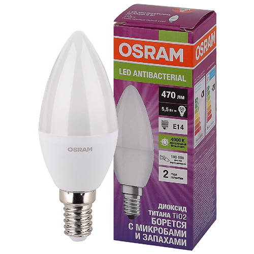 Антибактериальная светодиодная лампа Osram с колбой в форме свечи и стандартным резьбовым цоколем Е14 серии LED Antibacterial Classic предназначена для бытового использования.