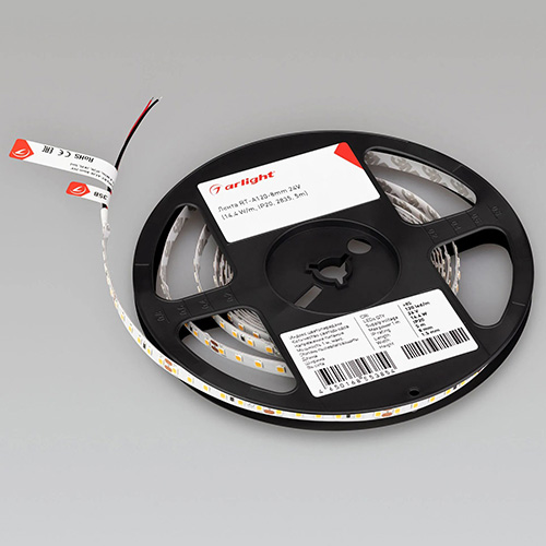 Светодиодная лента Arlight серии RT A120, шириной 8 мм, применяется для организации освещения помещений и декоративной подсветки интерьера, создания световой рекламы: подсветки лайтбоксов, вывесок, букв, витрин.