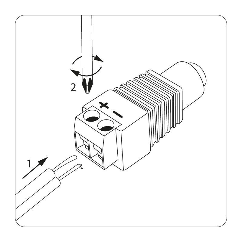 Двухконтактное гнездо монтируется на кабель с помощью винтовых зажимов и соединяется с штекером питания.