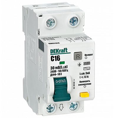 Автоматический выключатель дифференциального тока DEKraft ДИФ103-4.5кА-1N-016A-030-C (1P+N, 16 А, характеристика C, 30 мА, 4,5 кА, тип АС)