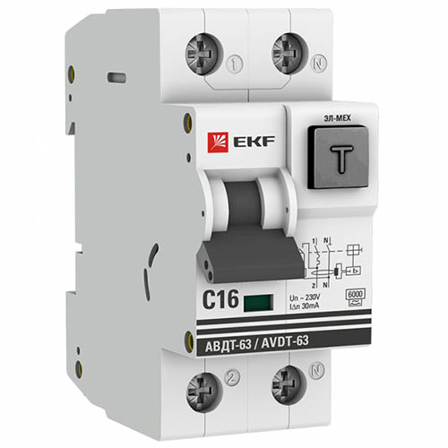 Автоматический выключатель дифференциального тока АВДТ-63 16А/30мА EKF PROxima (характеристика С, электромеханический, тип А, 6 кА)