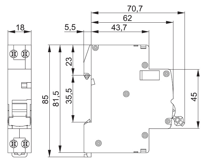 - Компактное исполнение 18 мм (полюс + нейтраль).