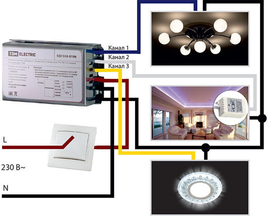 - Не надо тянуть дополнительные провода, можно подключать к 2-проводной системе 2 - 4 канала нагрузки, например: люстра + точечные светильники + светодиодная лента.