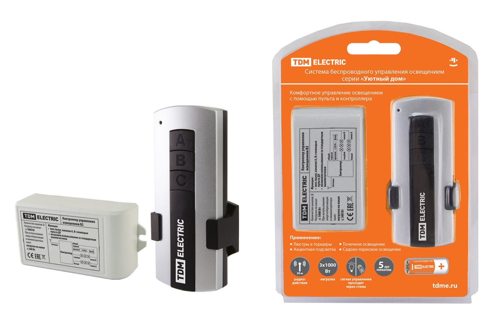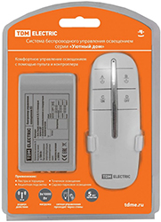 Комплект для беспроводного управления освещением ПУ1-МK-3 серии "Уютный дом" TDM включает пульт дистанционного управления и контроллер.