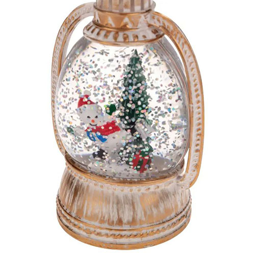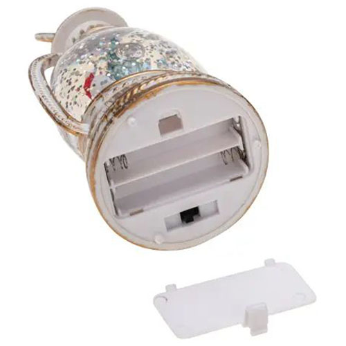 Вьюга, создаваемая сверкающими блестками, кружится внутри колбы и подсвечивается светодиодами теплого белого цвета.