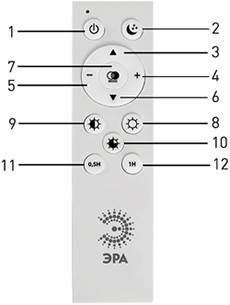 1 - включение / выключение светильника. 3 - увеличение яркости. 5 - уменьшение цветовой температуры. 7 - переключение цветовой температуры (3000 К - 4000 К - 6500 К) - максимальная яркость. 9 - яркость светильника - 50%. 11 - установка таймера отключения на 30 минут (автоматическое отключение светильника через 30 мин.). |