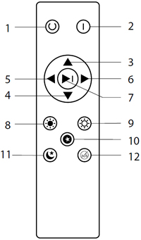 1 - кнопка выкл. 3 - увеличение яркости. 5 - плавный переход цвета свечения к холодному белому (6500 К). 7 - переключение цветовой температуры 3000 К / 4000 К / 6500 К. 9 - холодный белый цвет свечения (6500 К). 11 - режим "ночник". |