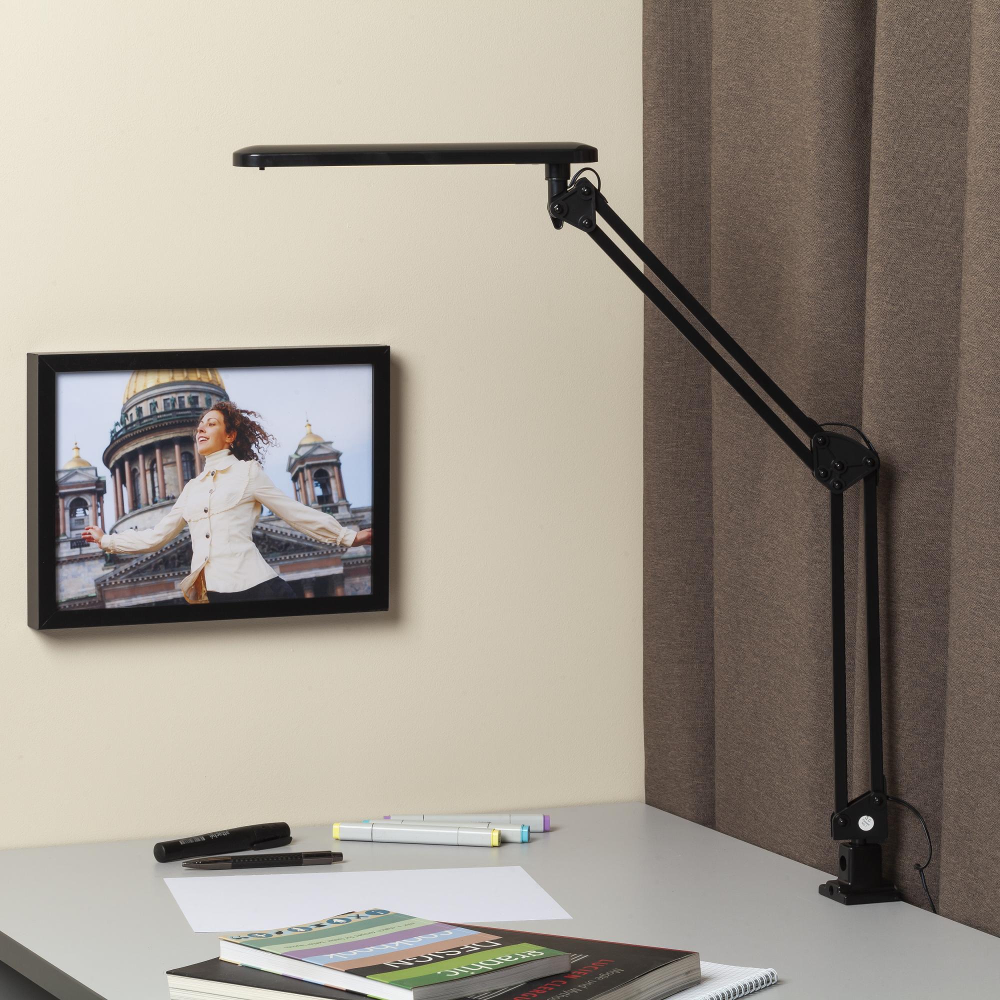 Настольный светильник ЭРА NLED-441-7W-BK со светодиодами (LED) в качестве источников света. Выключатель на плафоне. Высота плафона регулируется двухсекционной сгибающейся стойкой. Удобное крепление на струбцину к любой плоской поверхности.