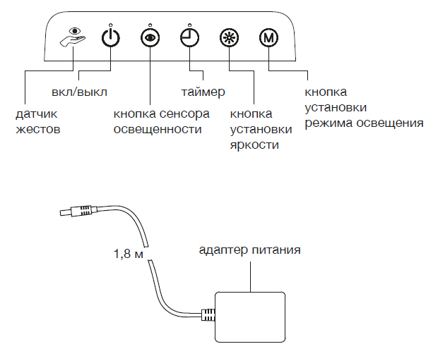 - Жестовое управление: проведите рукой перед датчиком жестов на расстоянии около 10 см для включения / выключения света.
