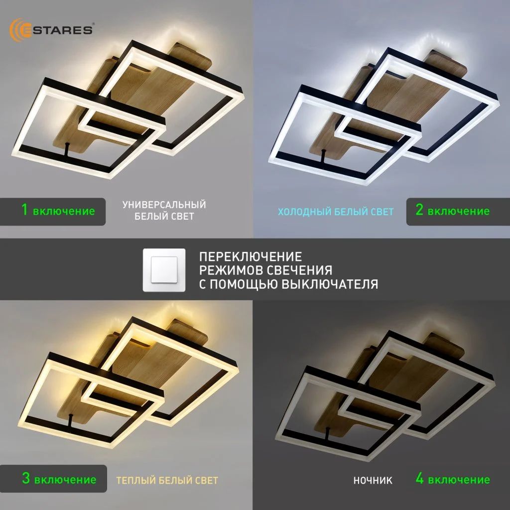 Светильник потолочный светодиодный Woody Loft 85W 2S-APP-500x430x135-Black/Wood-220-IP20 Estares (8500 лм, 3000 - 6500 К, диммер) с подсветкой, с пультом ДУ, черный / светлое дерево