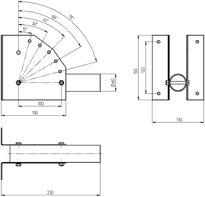 Кронштейн для уличного консольного светильника с переменным углом (шаг 15°) монтируется на поверхность при помощи болтов или бандажной лентой.