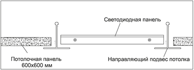 Панель устанавливают на место потолочной плиты 600 x 600 мм в межпотолочное пространство.